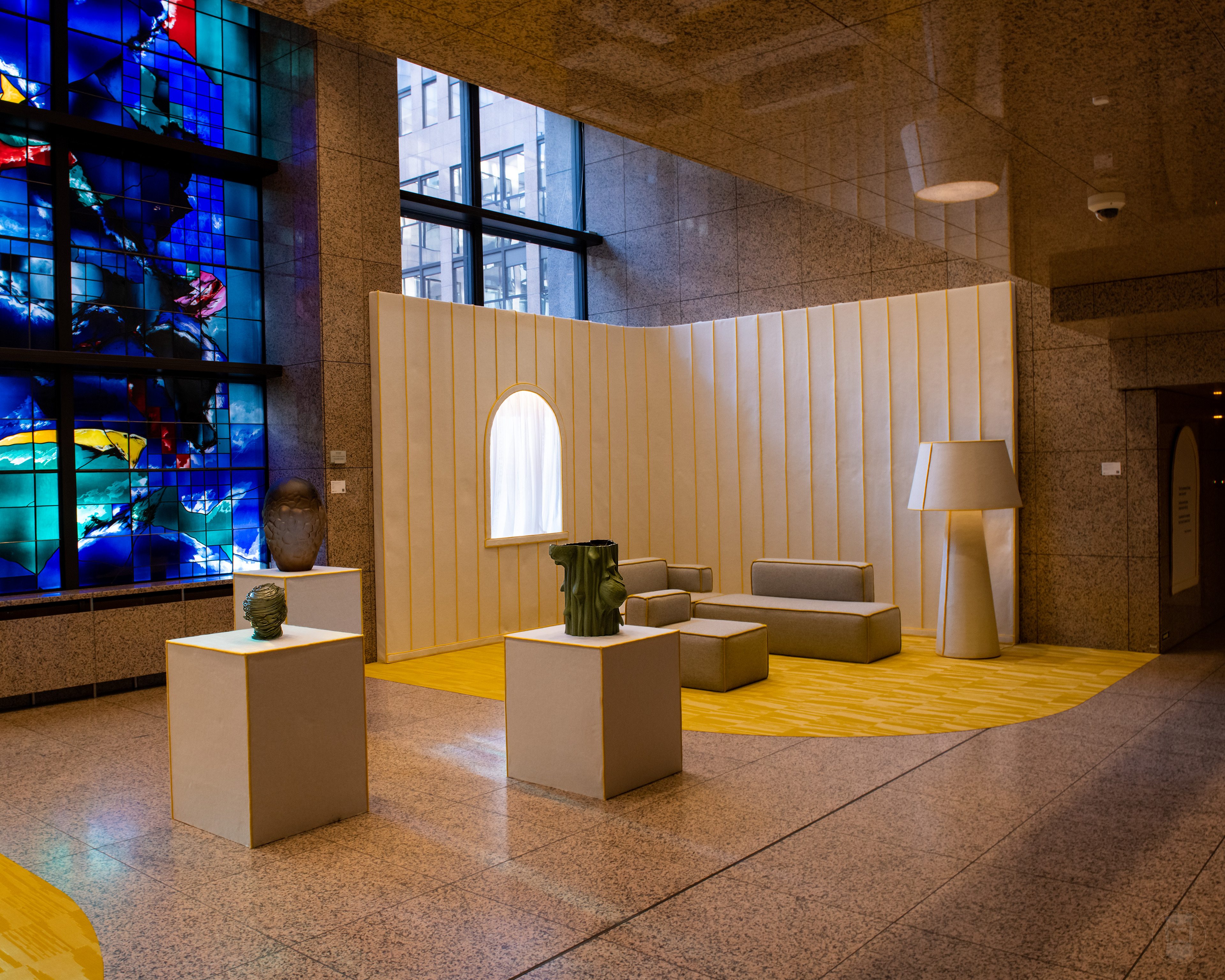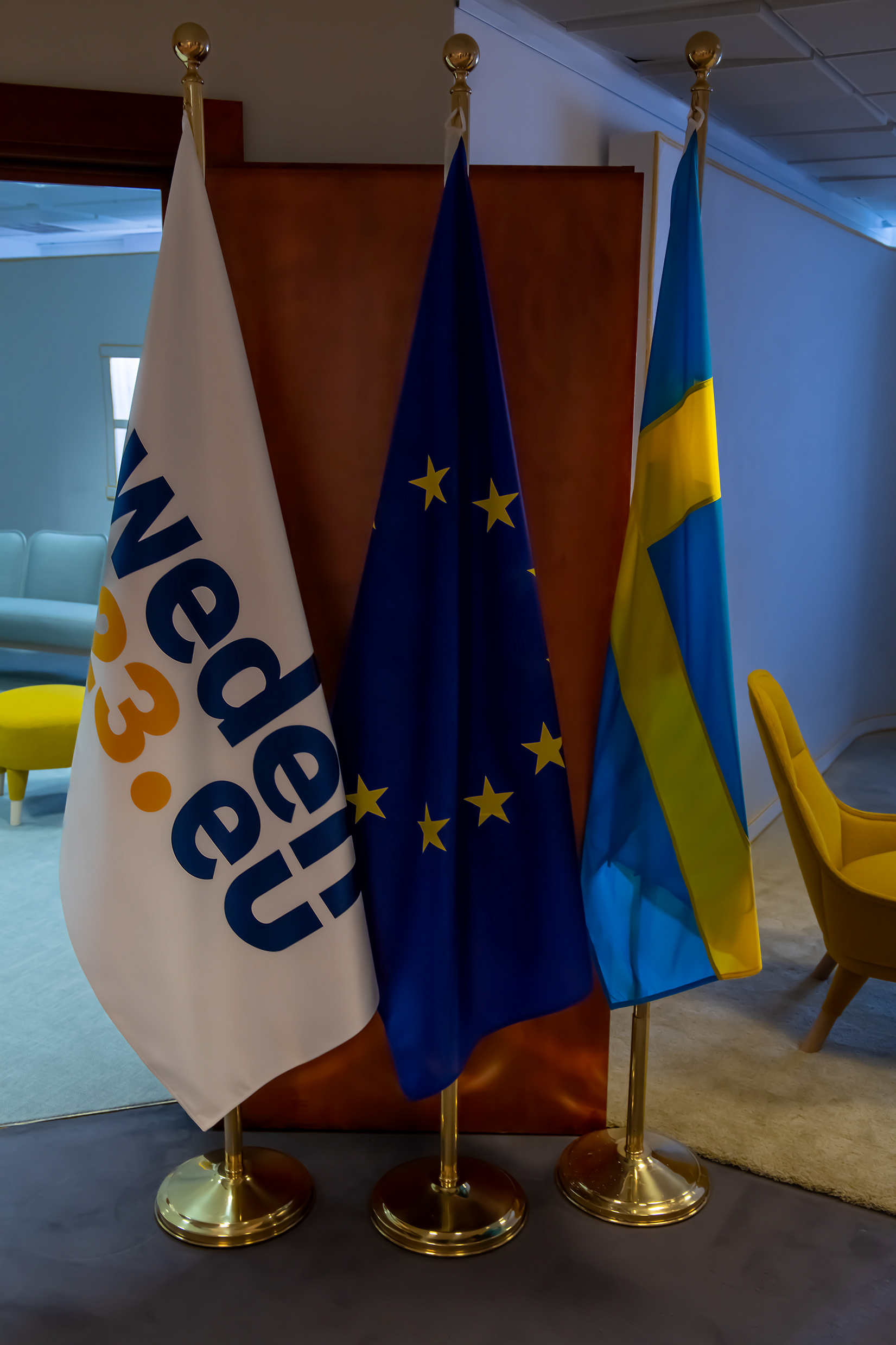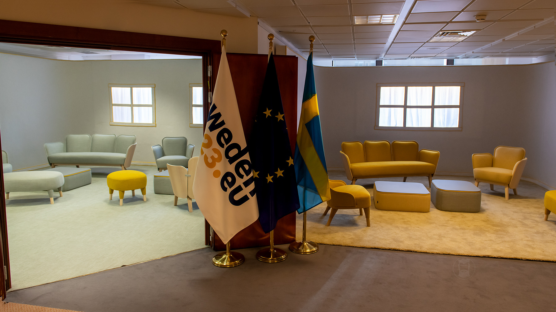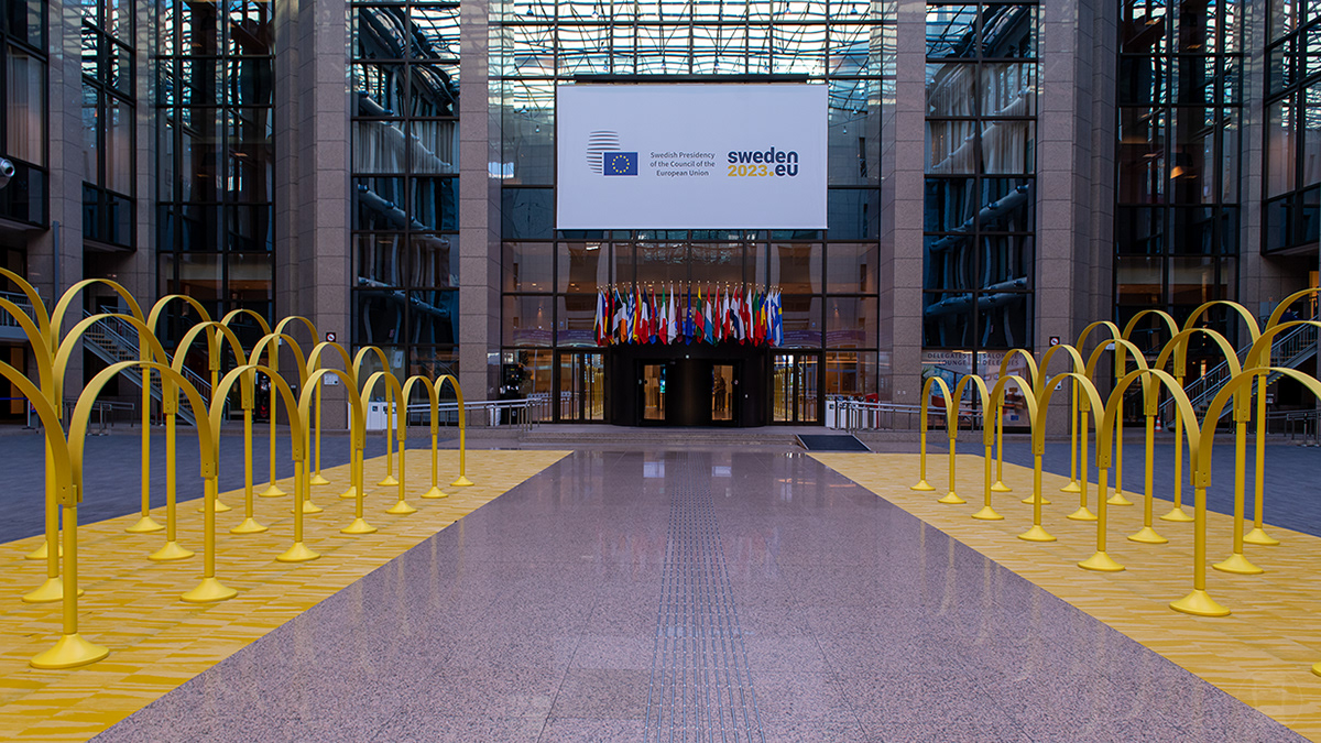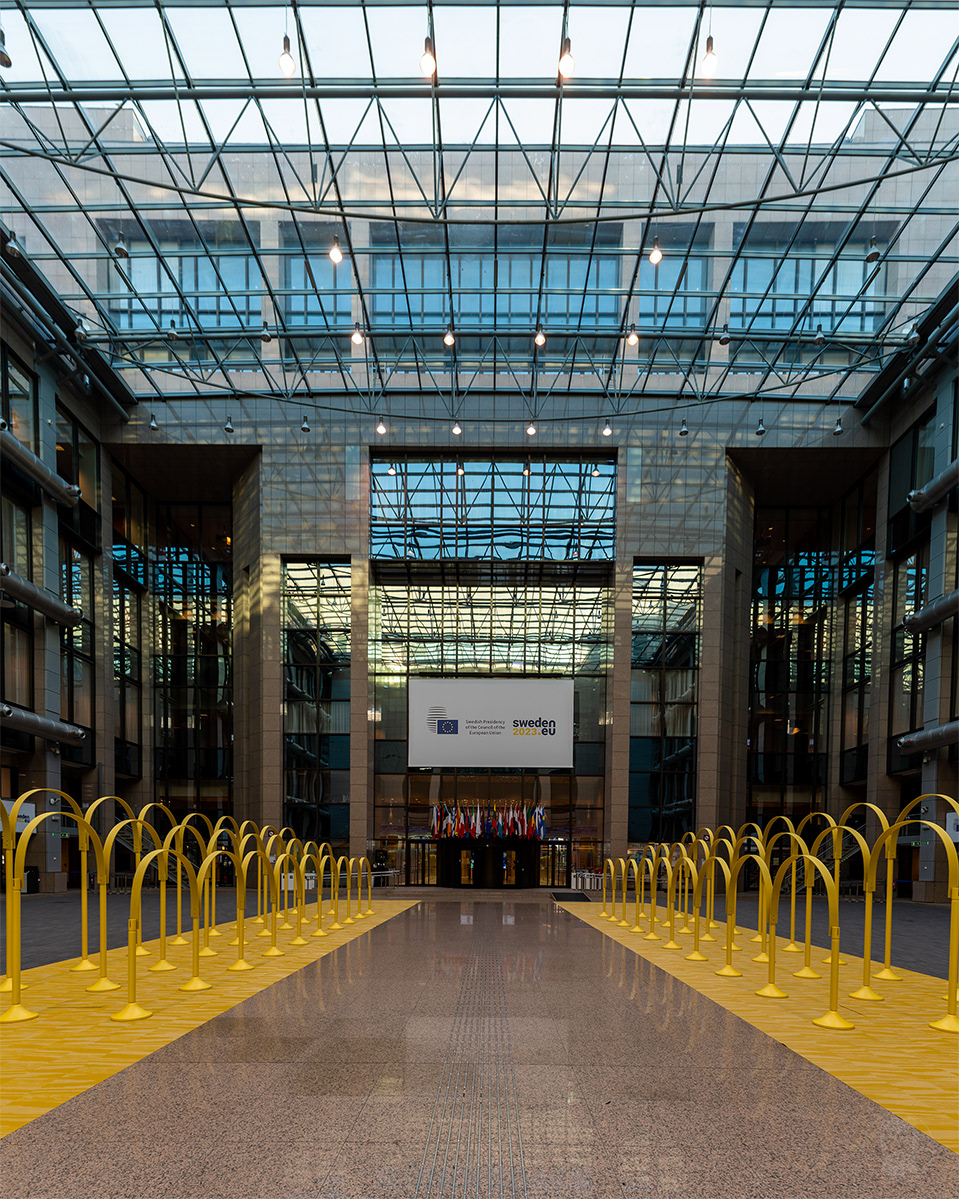 Meeting in the council working party. Photos of the Swedish Presidency design concept "The Yellow Thread" in the Justus Lipsius building . The concept installed was created by the design studio Färg & Blanche.
